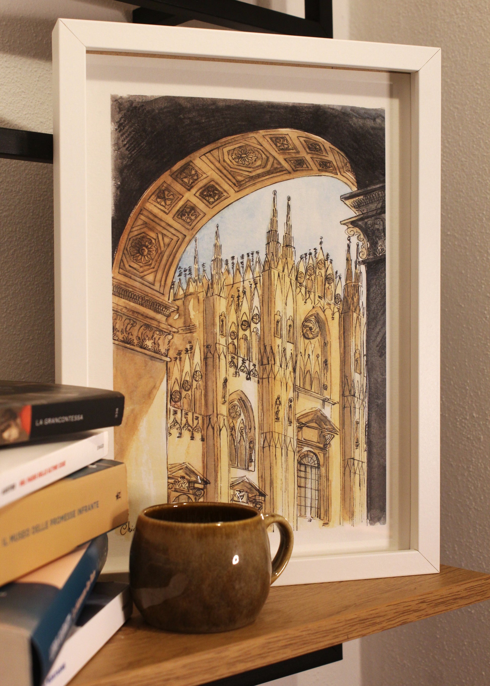 Una stampa artistica creata da una mia illustrazione originale ad acquerello e inchiostro, ispirata al Duomo di Milano, conosciuto per le sue guglie, emblema della città capitale della moda.