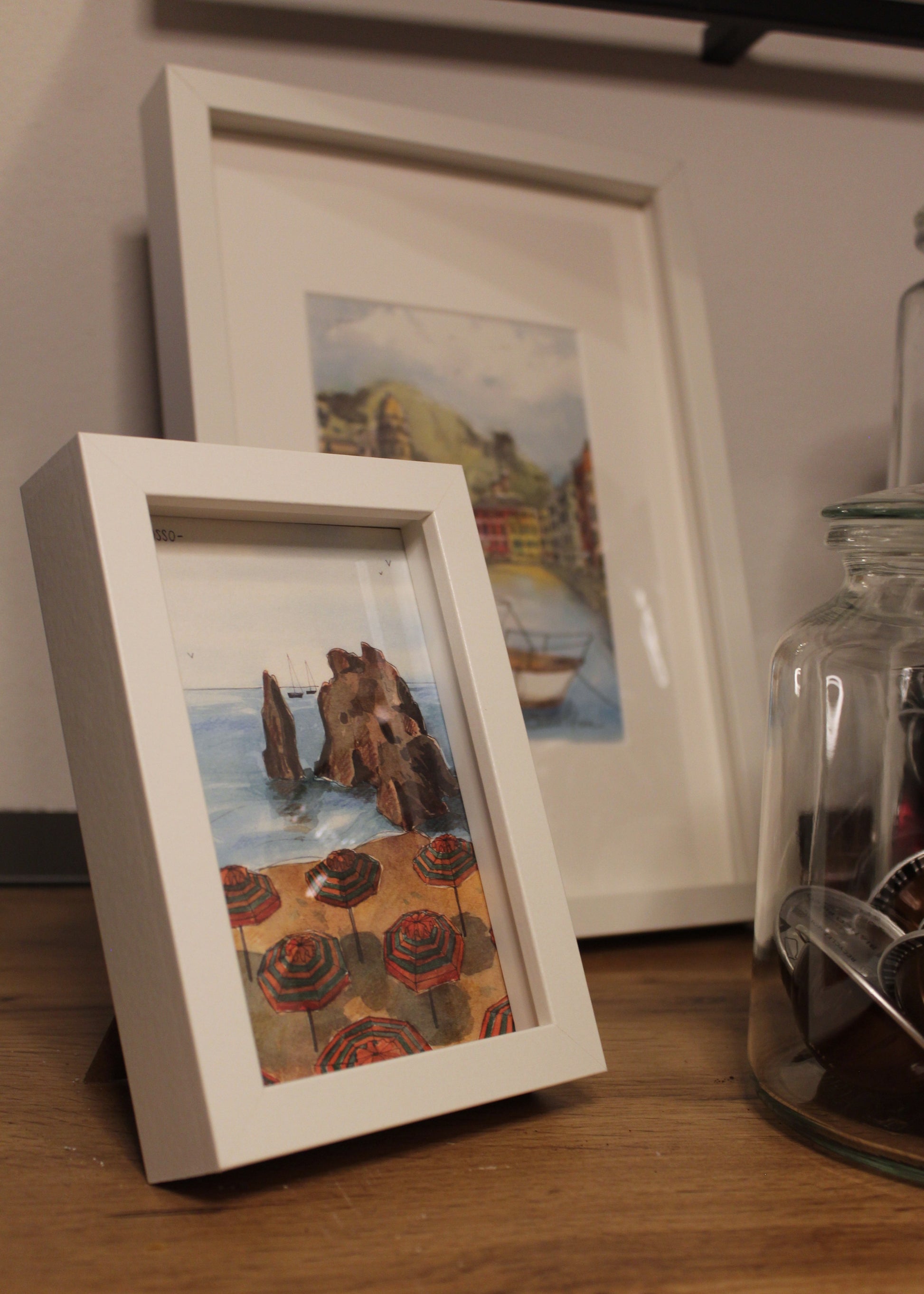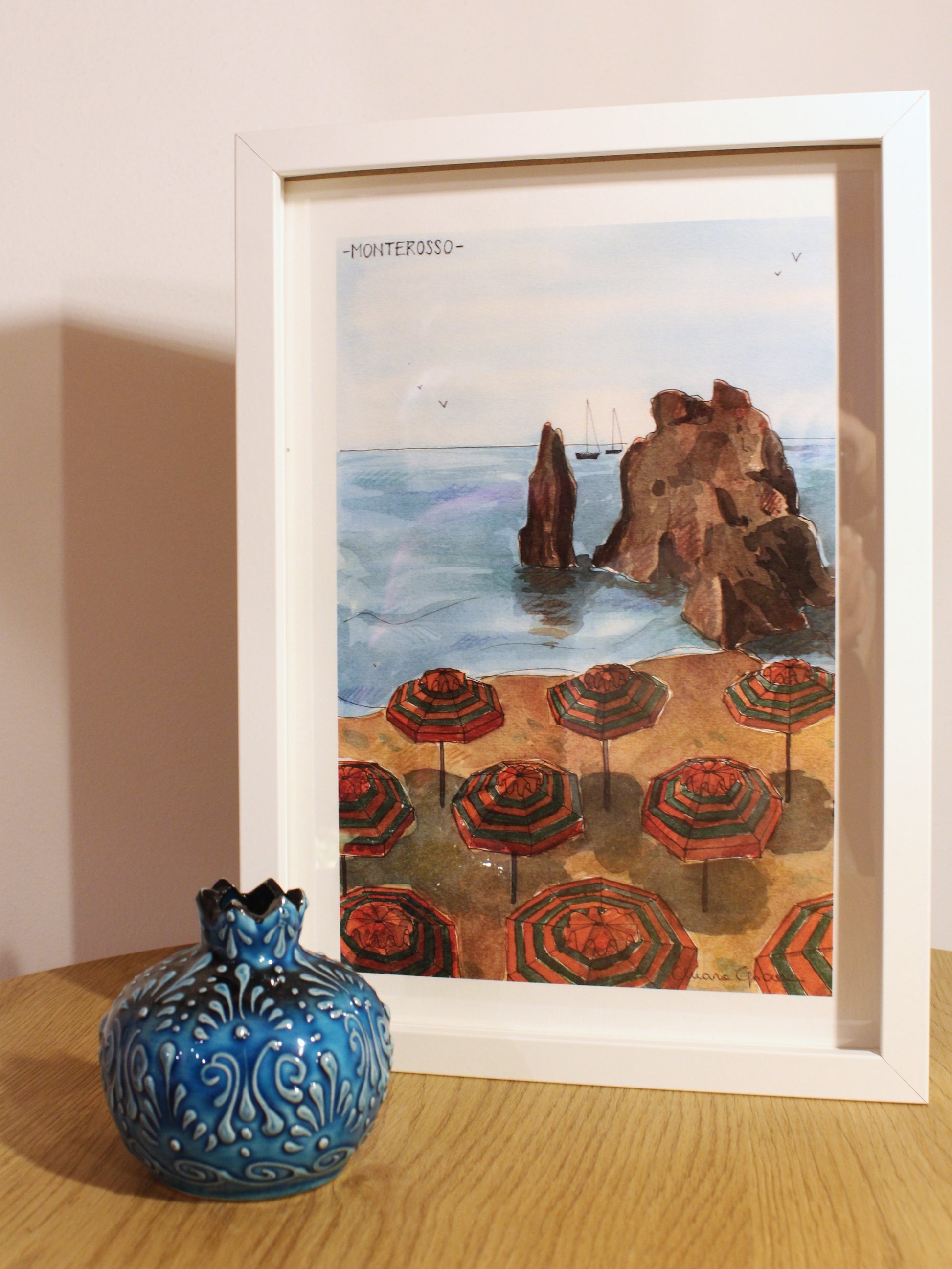 Una stampa artistica creata da una mia illustrazione originale ad acquerello e china, ispirata all'incredibile paesino affacciato sul mare di Monterosso, la prima meravigliosa tappa delle Cinque Terre.