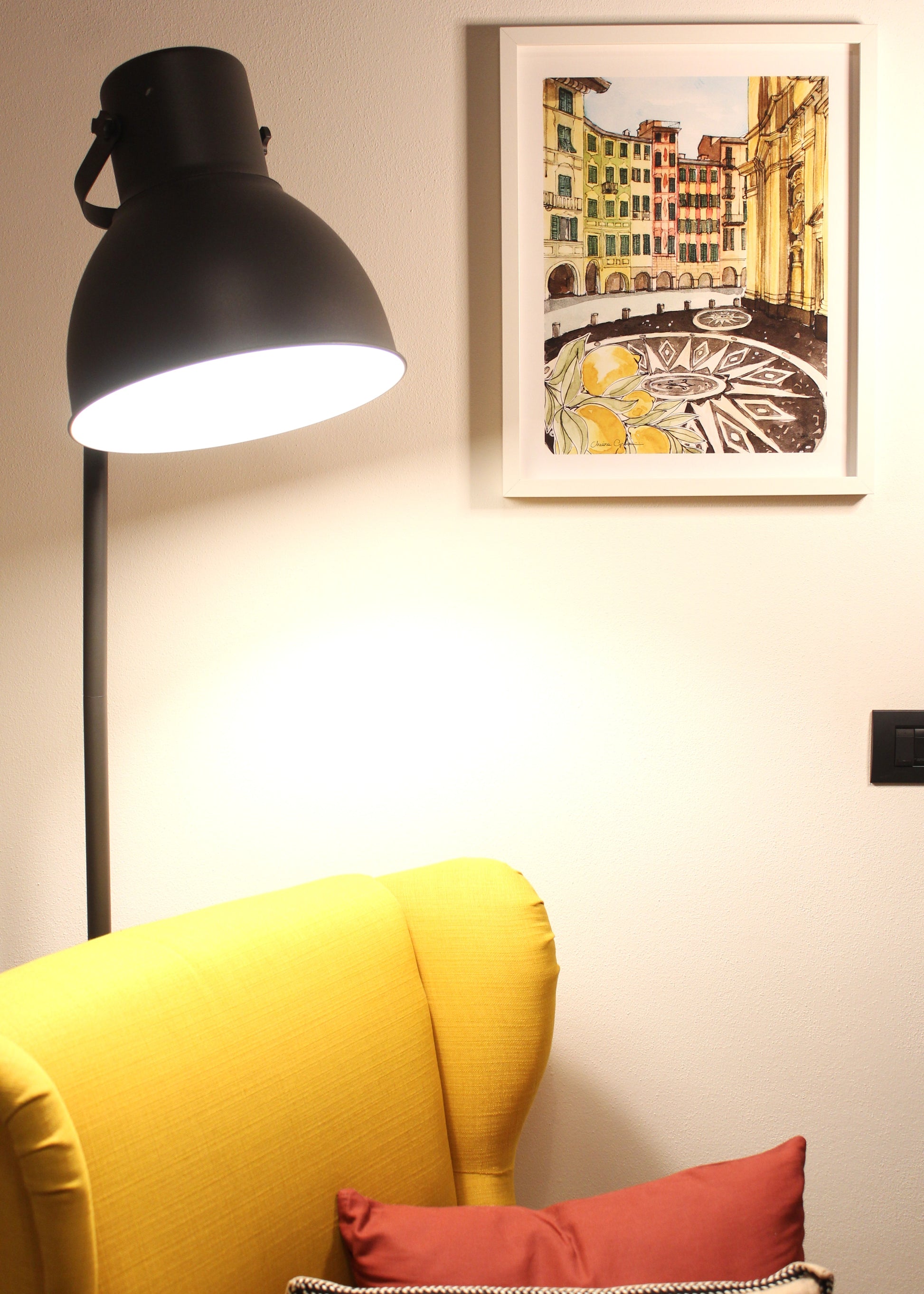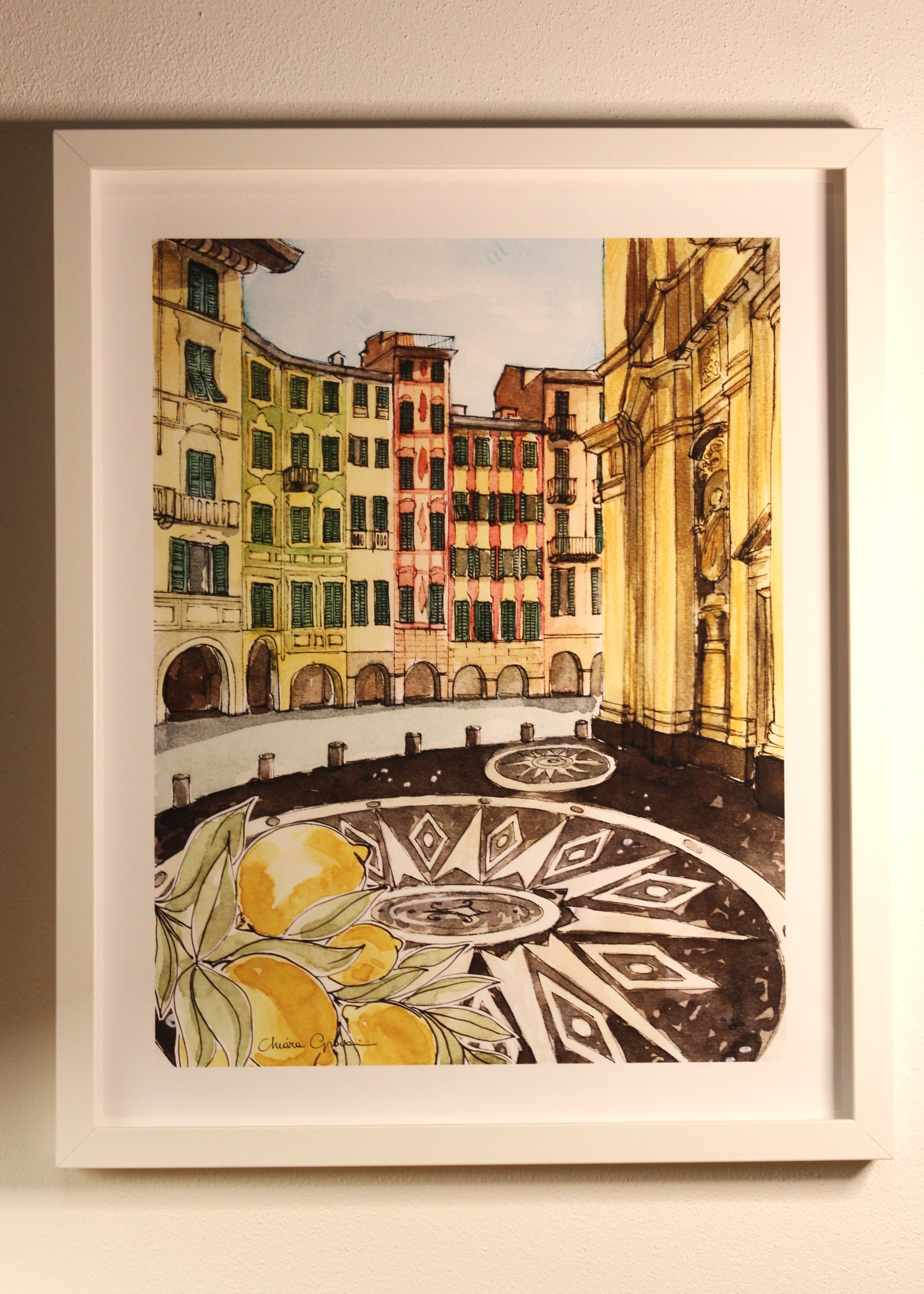 Una stampa artistica creata da una mia illustrazione originale ad acquerello e inchiostro, ispirata a Piazza Caprera di Santa Margherita Ligure, cuore vivace e scenografico della città.
