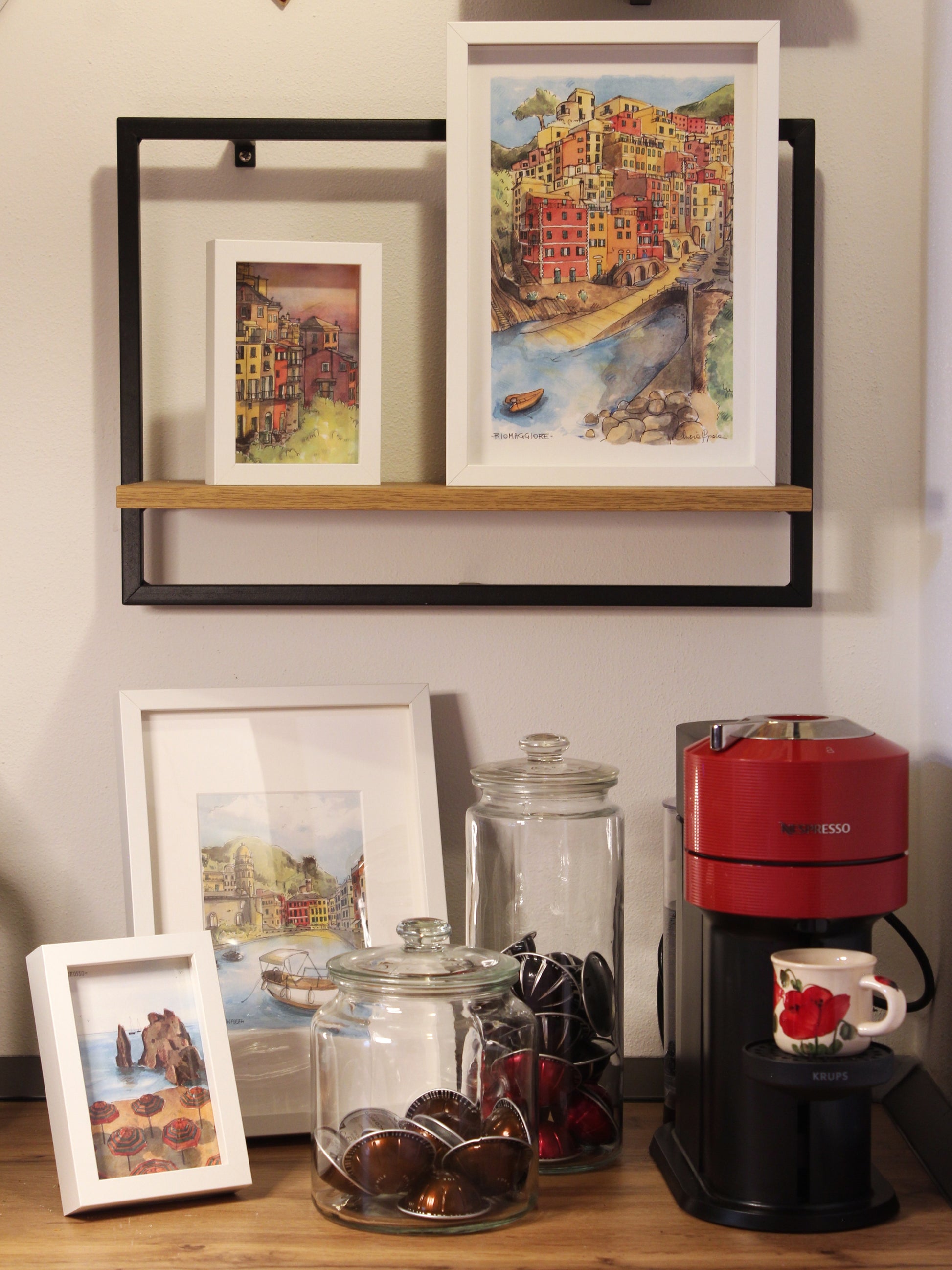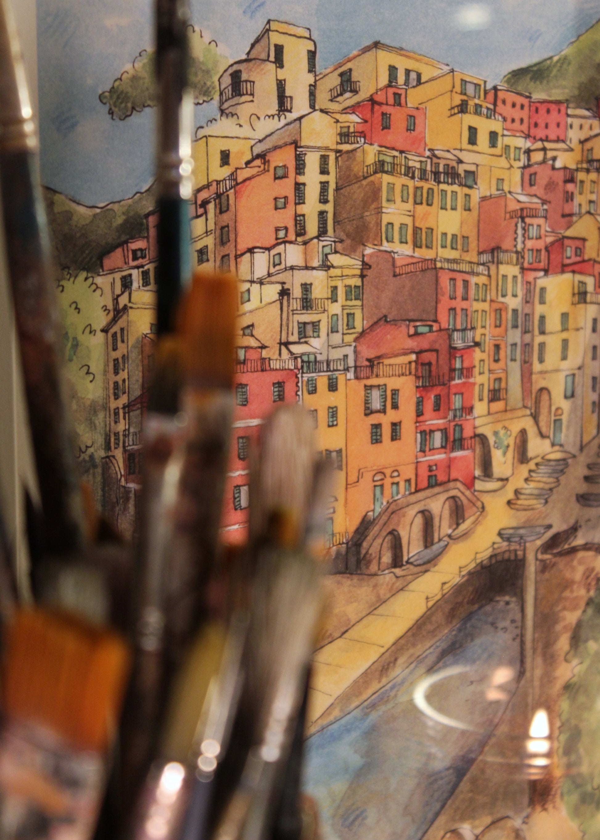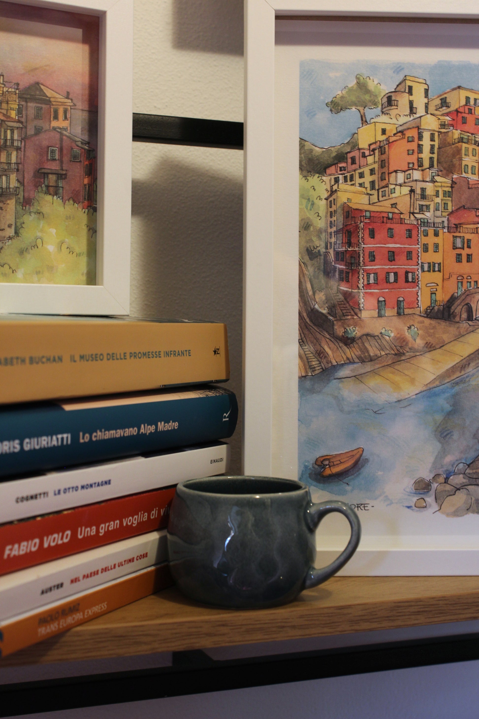 Una stampa artistica creata da una mia illustrazione originale ad acquerello e inchiostro, ispirata dalla vista senza fiato dalla terrazza di Riomaggiore, nel cuore delle Cinque Terre.