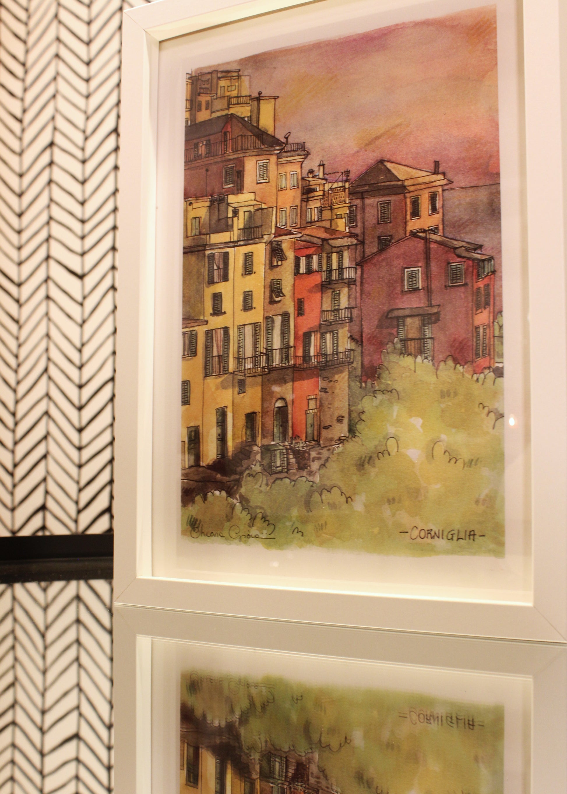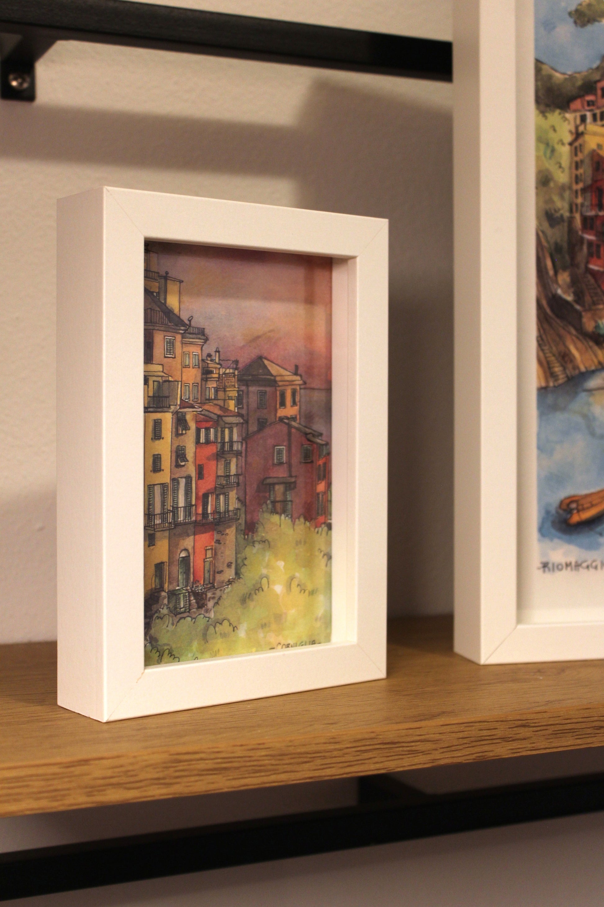 Una stampa artistica creata da una mia illustrazione originale ad acquerello e inchiostro, ispirata all'affascinante e arroccato paesino di Corniglia, nel cuore delle Cinque Terre.